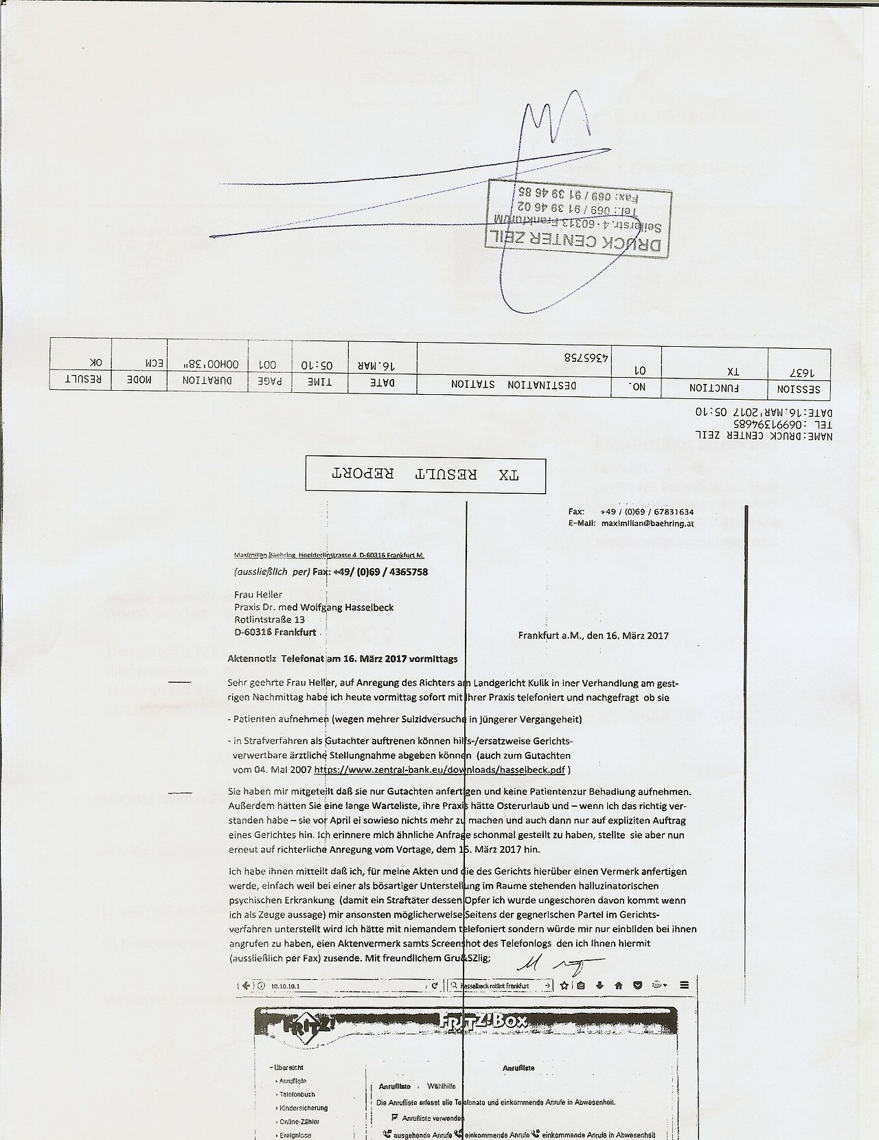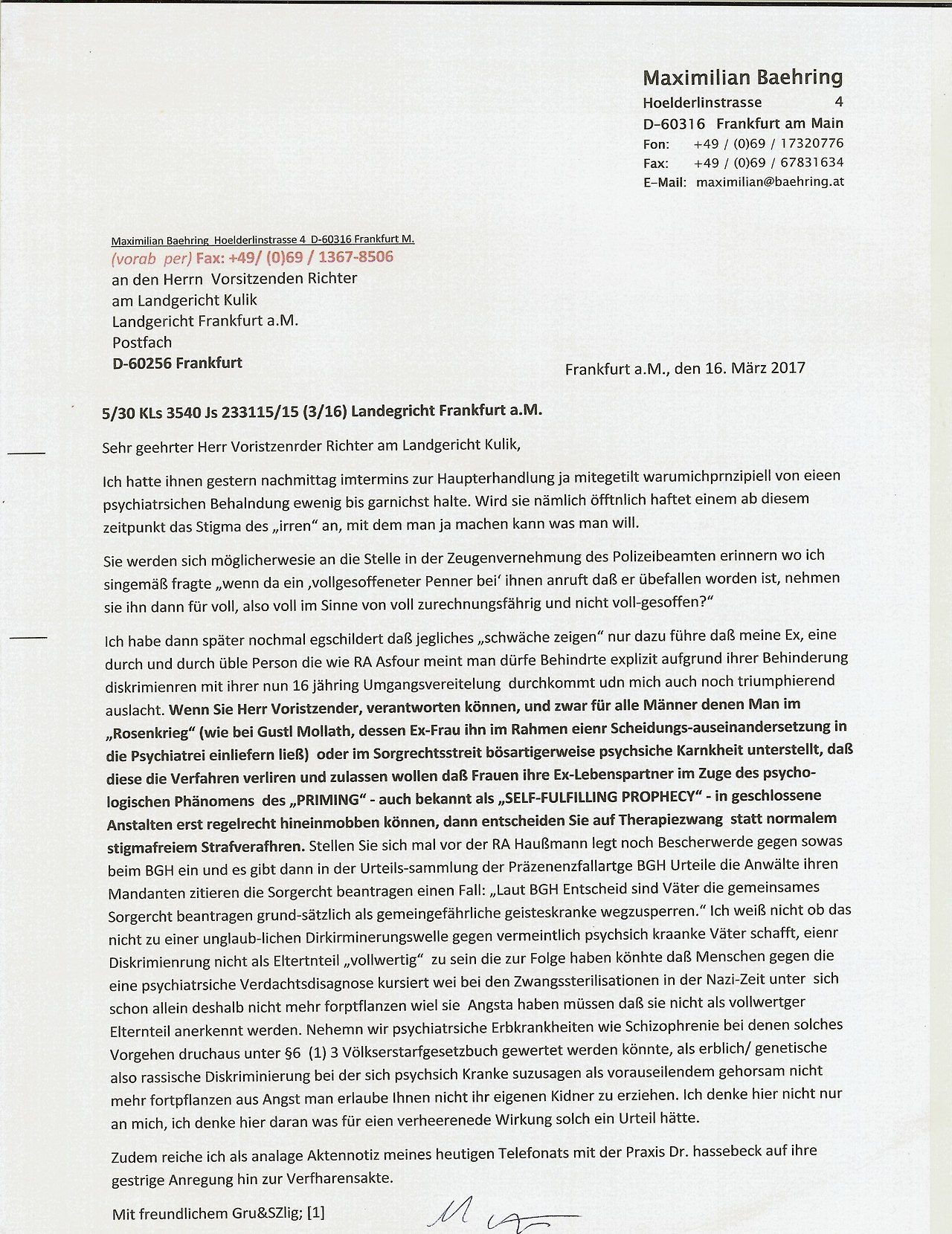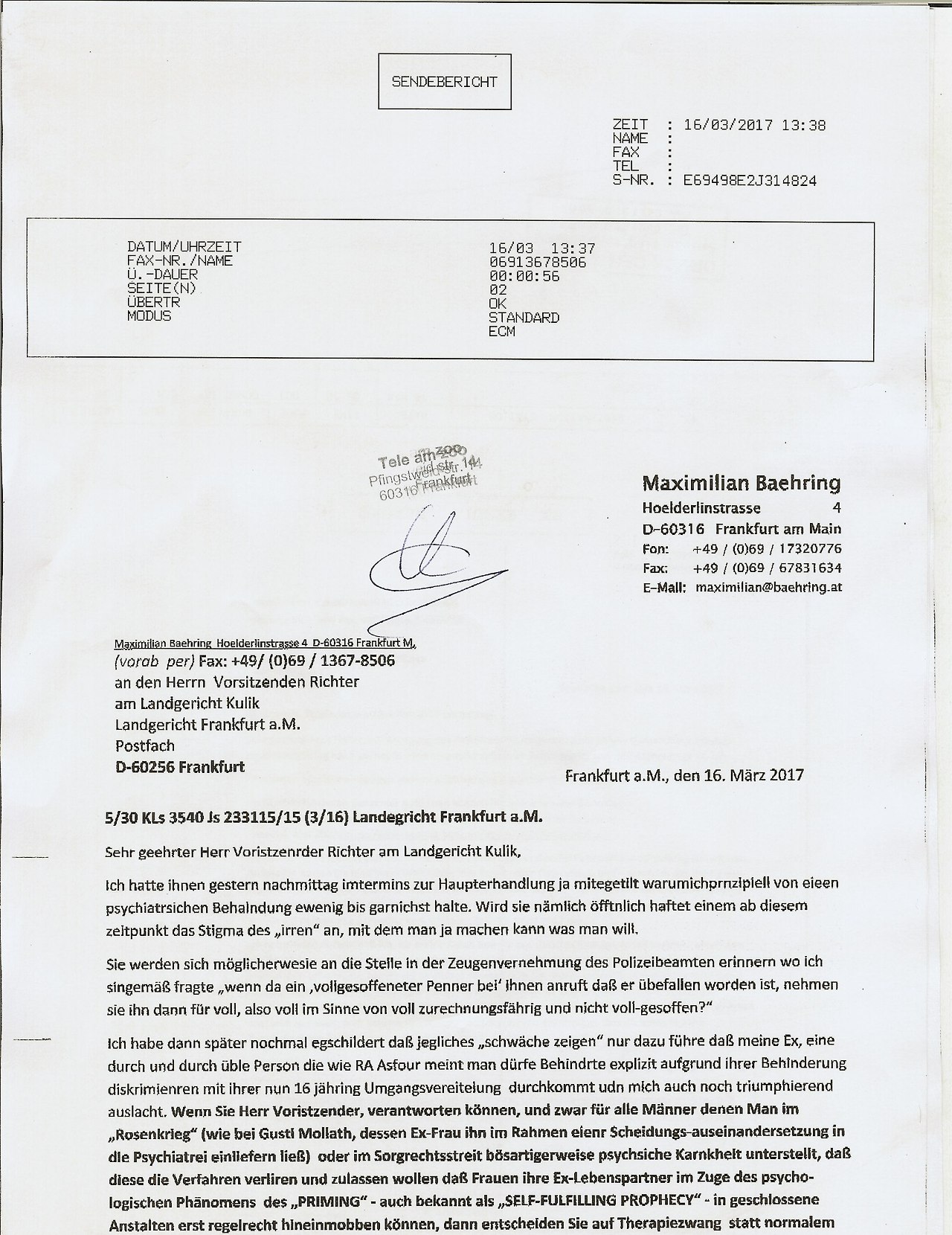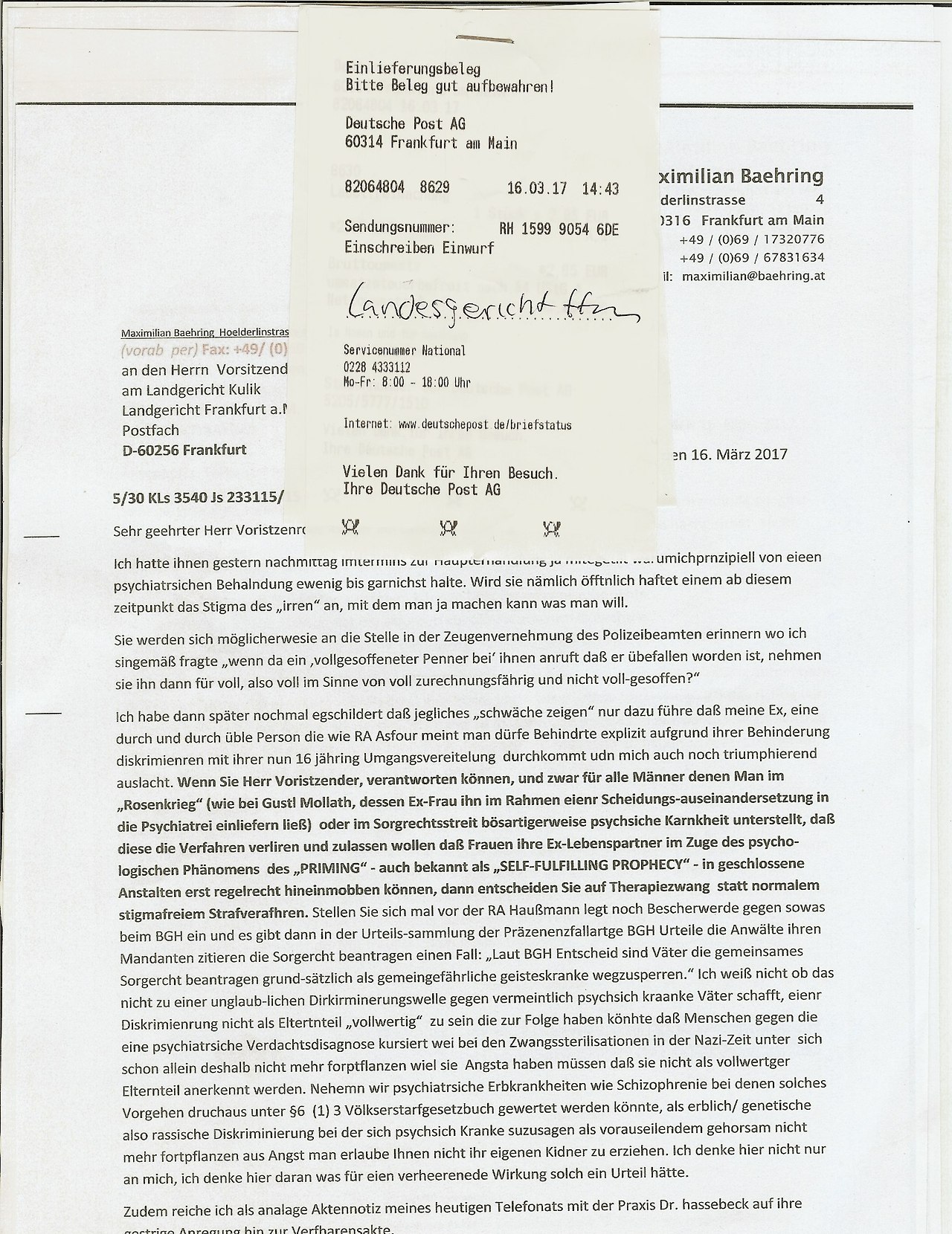 16.03.2017 12:08 Ich hab Haussmann tefonnumemr aufegschriebn statt der Faxnumemr aber das it kein problem hab ihn agerufen undmri die richtige numemr besorgt. Bei ghasselbeck gan es von dr pfingsweidstraße aus dasProblem daß das Fax nicht durchging. Vom Copy cnetr zeil aus ginges allerdings druch obgleich zunächt der Anrufbeantworter antwortet mit eienr bndansage man könne unter dieser Numemr auch ien Fax senden. Das sind ie anderenTelfontae. Selstamerwiese ist in der Pfingsweidtsraße angeblich das Compüuter-Terminal abgestürzt von dem aus die Einschreibebrirfe abgeschickt werden. Qutiitungen/Kosten: Da kommt noch 1 Euro obendrauf für das Fax vom coY Center Zeil aus. 4Wir din bereits jetztw irder bei über 5 Euro Portogebürhen noch ohne daß das eisnwurfeisnchriebn ans Gericht mit dabei ist dessen Versand man möglicherweise sogar absichtlich zu be-/verhindrn sucht. Frankfurt a.M., den 16. März 2017 Sehr geehrter Herr Voristzenrder Richter am Landgericht Kulik, Ich hatte ihnen gestern nachmittag imtermins zur Haupterhandlung ja mitegetilt warumichprnzipiell von eieen psychiatrsichen Behalndung ewenig bis garnichst halte. Wird sie nämlich öfftnlich haftet einem ab diesem zeitpunkt das Stigma des ?irren? an, mit dem man ja machen kann was man will. Sie werden sich möglicherwesie an die Stelle in der Zeugenvernehmung des Polizeibeamten erinnern wo ich singemäß fragte ?wenn da ein ?vollgesoffeneter Penner bei? ihnen anruft daß er übefallen worden ist, nehmen sie ihn dann für voll, also voll im Sinne von voll zurechnungsfährig und nicht voll-gesoffen?? Ich habe dann später nochmal egschildert daß jegliches ?schwäche zeigen? nur dazu führe daß meine Ex, eine durch und durch üble Person die wie RA Asfour meint man dürfe Behindrte explizit aufgrund ihrer Behinderung diskrimienren mit ihrer nun 16 jähring Umgangsvereitelung durchkommt udn mich auch noch triumphierend auslacht. Wenn Sie Herr Voristzender, verantworten können, und zwar für alle Männer denen Man im ?Rosenkrieg? (wie bei Gustl Mollath, dessen Ex-Frau ihn im Rahmen eienr Scheidungs-auseinandersetzung in die Psychiatrei einliefern ließ) oder im Sorgrechtsstreit bösartigerweise psychsiche Karnkheit unterstellt, daß diese die Verfahren verliren und zulassen wollen daß Frauen ihre Ex-Lebenspartner im Zuge des psycho-logischen Phänomens des ?PRIMING? - auch bekannt als ?SELF-FULFILLING PROPHECY? - in geschlossene Anstalten erst regelrecht hineinmobben können, dann entscheiden Sie auf Therapiezwang statt normalem stigmafreiem Strafverafhren. Stellen Sie sich mal vor der RA Haußmann legt noch Bescherwerde gegen sowas beim BGH ein und es gibt dann in der Urteils-sammlung der Präzenenzfallartge BGH Urteile die Anwälte ihren Mandanten zitieren die Sorgercht beantragen einen Fall: ?Laut BGH Entscheid sind Väter die gemeinsames Sorgercht beantragen grund-sätzlich als gemeingefährliche geisteskranke wegzusperren.? Ich weiß nicht ob das nicht zu einer unglaub-lichen Dirkirminerungswelle gegen vermeintlich psychsich kraanke Väter schafft, eienr Diskrimienrung nicht als Eltertnteil ?vollwertig? zu sein die zur Folge haben könhte daß Menschen gegen die eine psychiatrsiche Verdachtsdisagnose kursiert wei bei den Zwangssterilisationen in der Nazi-Zeit unter sich schon allein deshalb nicht mehr forptflanzen wiel sie Angsta haben müssen daß sie nicht als vollwertger Elternteil anerkennt werden. Nehemn wir psychiatrsiche Erbkrankheiten wie Schizophrenie bei denen solches Vorgehen druchaus unter §6 (1) 3 Völkserstarfgesetzbuch gewertet werden könnte, als erblich/ genetische also rassische Diskriminierung bei der sich psychsich Kranke suzusagen als vorauseilendem gehorsam nicht mehr fortpflanzen aus Angst man erlaube Ihnen nicht ihr eigenen Kidner zu erziehen. Ich denke hier nicht nur an mich, ich denke hier daran was für eien verheerenede Wirkung solch ein Urteil hätte. Zudem reiche ich als analage Aktennotiz meines heutigen Telefonats mit der Praxis Dr. hassebeck auf ihre gestrige Anregung hin zur Verfharensakte. Mit freundlichem Gru&SZlig; [1] +++ Maximilian Baehring Hoelderlinstrasse 4 D-60316 Frankfurt M. (aussließlich per) Fax: +49/ (0)69 / 4365758 Frau Heller Frankfurt a.M., den 16. März 2017 - Patienten aufnehmen (wegen mehrer Suizidversuche in jüngerer Vergangeheit) - in Strafverfahren als Gutachter auftrenen können hilfs-/ersatzweise Gerichts- Sie haben mitr mitegeteilt daß sie nur Gutachten anfertigen udnkeien Patientenzur Bahedlung aufnehemen. Außerdem hättenSie eien lange Warteliste, ihre Praxis hätte Osterurlaub und - wenn ich das richtigverstanden habe - sie vor April ei sowieso nichts mehr zu machen und auch dann nur auf Auftrag eines Gerichtes hin. Ich erinnere mich ähnliche Anfrage schonmal gestellt zu haben, stellte sie aber nun erneut auf richterliche Anregung vom Vortage, dem 15. März 2017 hin. Ich habe ihnen mitteilt daß ich, für meienakten und die des Gerichts hierüber einen Vermerk anfertigen werde, einfach weil bei einer als bösartiger Unterstellung im Raume stehenden halluzinatorischen psychischen Erkrankung (damit ein Straftäter dessen Opfer ich wurde ungeschoren davon kommt wenn ich als Zueg aussage) mir ansonsten möglicherweise Seitens der gegnerischen Partei im Gerichtsverfahren unterstellt wird ich hätte mit niemandem telefoniert sondern würde mir nur einbilden bei ihnen angrufen zu haben, eien Aktenvermerk samts Screenshot des Telefonlogs den ich Ihnen hiermit (aussließlich per Fax) zusende. +++ Maximilian Baehring Hoelderlinstrasse 4 D-60316 Frankfurt M. Herrn Rechtsnwalt Frankfurt a.M., den 16. März 2017 5/30 KLs 3540 Js 233115/15 (3/16) LandGEricht Frankfurt a.M. Herr Hau&SZlig;mann [1] [ ] "ach wie gut da&SZlig; niemand wei&SZlig;? Mit freundlichem Gru&SZlig; [1] [0] "201703161208-158471854493-0.jpg" [1] "201703161208-158471854493-1.jpg" [2] "201703161208-158471854493-2.jpg" [3] "201703161208-158471854493-3.jpg" [4] "201703161208-158471854493-4.jpg" [