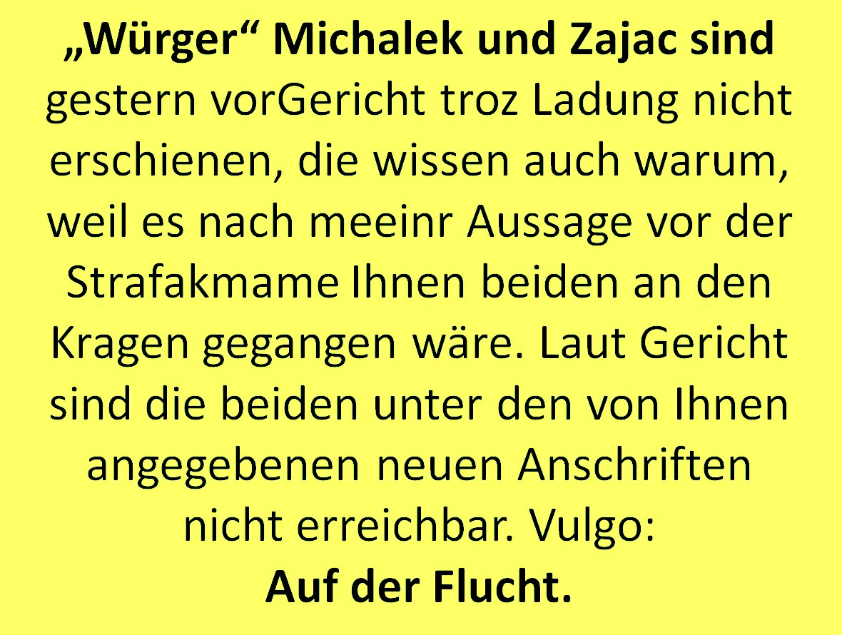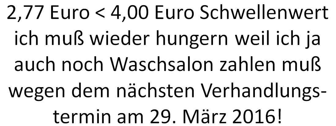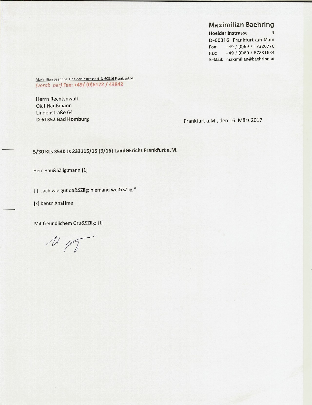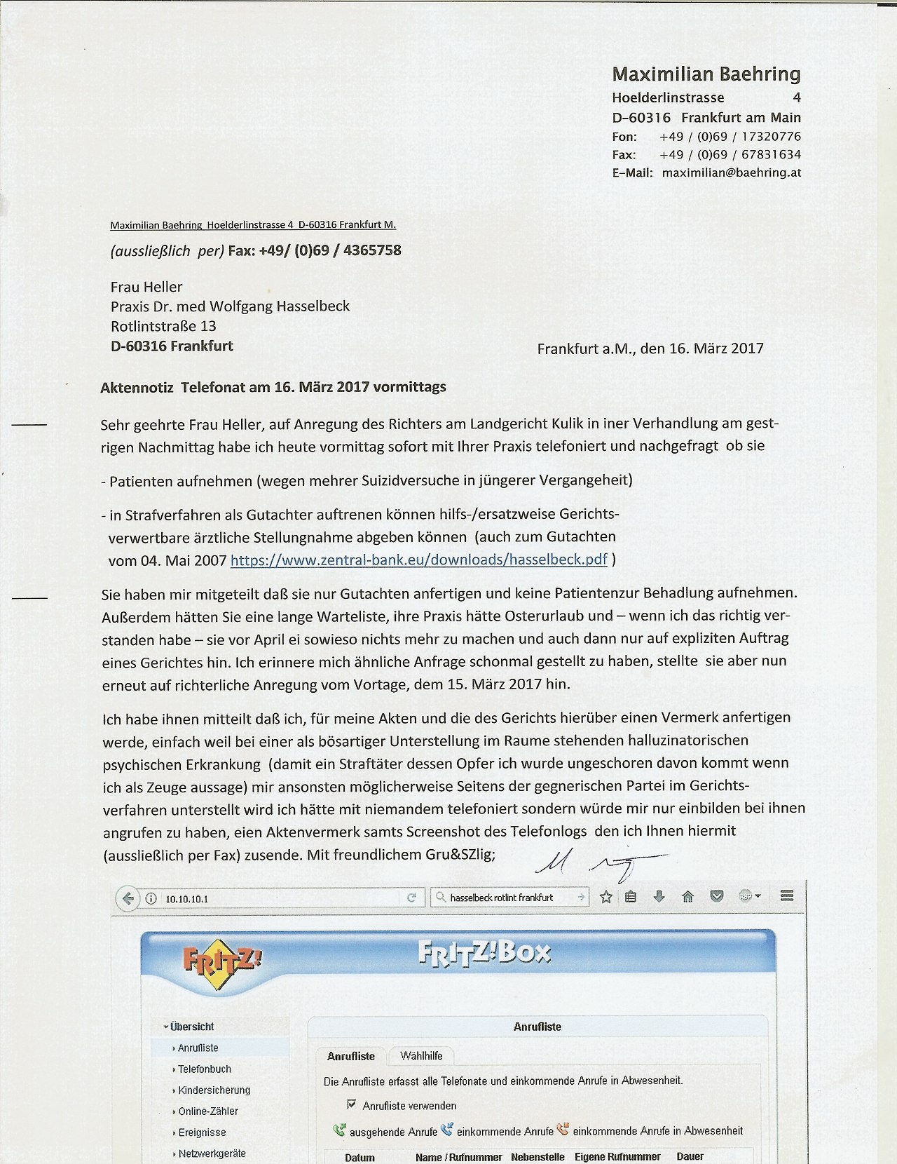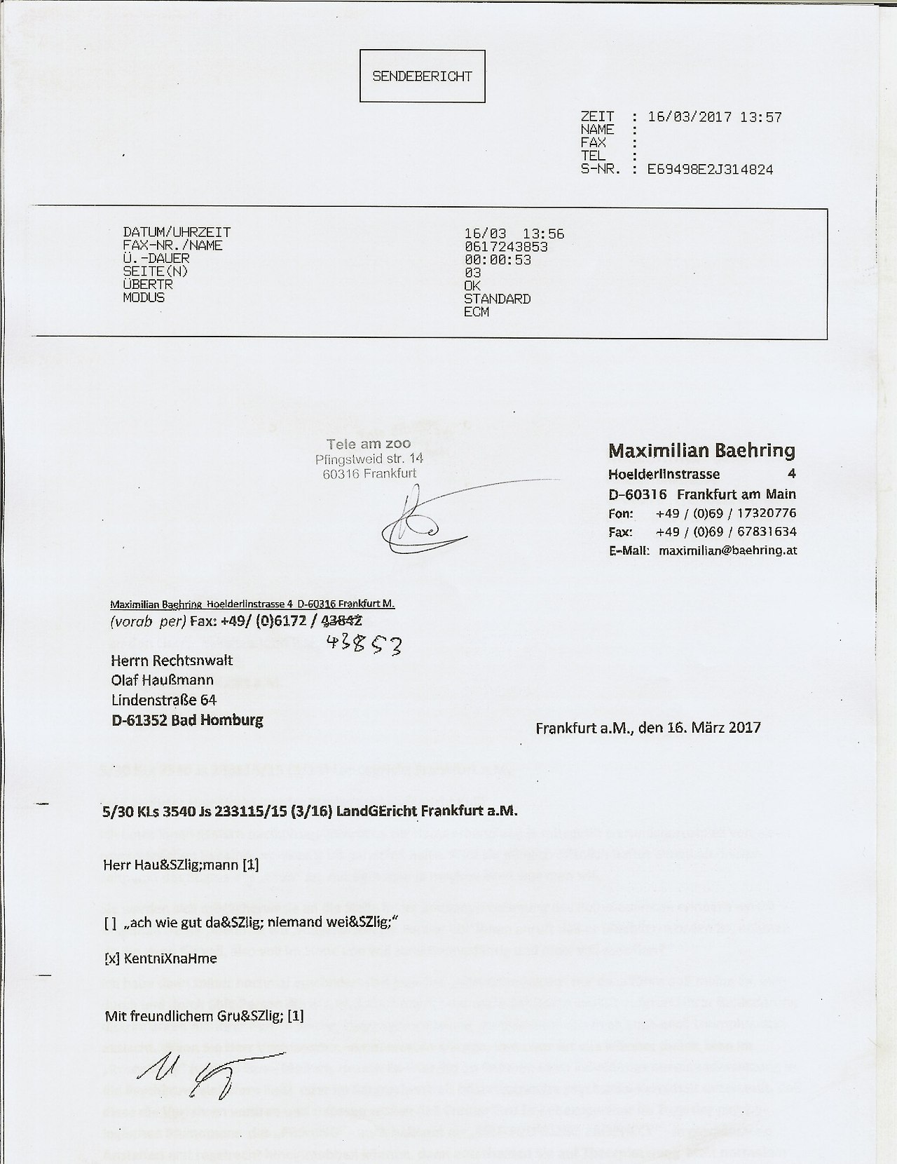 16.03.2017 12:08 Ich hab Haussmann tefonnumemr aufegschriebn statt der Faxnumemr aber das it kein problem hab ihn agerufen undmri die richtige numemr besorgt. Bei ghasselbeck gan es von dr pfingsweidstraße aus dasProblem daß das Fax nicht durchging. Vom Copy cnetr zeil aus ginges allerdings druch obgleich zunächt der Anrufbeantworter antwortet mit eienr bndansage man könne unter dieser Numemr auch ien Fax senden. Das sind ie anderenTelfontae. Selstamerwiese ist in der Pfingsweidtsraße angeblich das Compüuter-Terminal abgestürzt von dem aus die Einschreibebrirfe abgeschickt werden. Qutiitungen/Kosten: Da kommt noch 1 Euro obendrauf für das Fax vom coY Center Zeil aus. 4Wir din bereits jetztw irder bei über 5 Euro Portogebürhen noch ohne daß das eisnwurfeisnchriebn ans Gericht mit dabei ist dessen Versand man möglicherweise sogar absichtlich zu be-/verhindrn sucht. Frankfurt a.M., den 16. März 2017 Sehr geehrter Herr Voristzenrder Richter am Landgericht Kulik, Ich hatte ihnen gestern nachmittag imtermins zur Haupterhandlung ja mitegetilt warumichprnzipiell von eieen psychiatrsichen Behalndung ewenig bis garnichst halte. Wird sie nämlich öfftnlich haftet einem ab diesem zeitpunkt das Stigma des ?irren? an, mit dem man ja machen kann was man will. Sie werden sich möglicherwesie an die Stelle in der Zeugenvernehmung des Polizeibeamten erinnern wo ich singemäß fragte ?wenn da ein ?vollgesoffeneter Penner bei? ihnen anruft daß er übefallen worden ist, nehmen sie ihn dann für voll, also voll im Sinne von voll zurechnungsfährig und nicht voll-gesoffen?? Ich habe dann später nochmal egschildert daß jegliches ?schwäche zeigen? nur dazu führe daß meine Ex, eine durch und durch üble Person die wie RA Asfour meint man dürfe Behindrte explizit aufgrund ihrer Behinderung diskrimienren mit ihrer nun 16 jähring Umgangsvereitelung durchkommt udn mich auch noch triumphierend auslacht. Wenn Sie Herr Voristzender, verantworten können, und zwar für alle Männer denen Man im ?Rosenkrieg? (wie bei Gustl Mollath, dessen Ex-Frau ihn im Rahmen eienr Scheidungs-auseinandersetzung in die Psychiatrei einliefern ließ) oder im Sorgrechtsstreit bösartigerweise psychsiche Karnkheit unterstellt, daß diese die Verfahren verliren und zulassen wollen daß Frauen ihre Ex-Lebenspartner im Zuge des psycho-logischen Phänomens des ?PRIMING? - auch bekannt als ?SELF-FULFILLING PROPHECY? - in geschlossene Anstalten erst regelrecht hineinmobben können, dann entscheiden Sie auf Therapiezwang statt normalem stigmafreiem Strafverafhren. Stellen Sie sich mal vor der RA Haußmann legt noch Bescherwerde gegen sowas beim BGH ein und es gibt dann in der Urteils-sammlung der Präzenenzfallartge BGH Urteile die Anwälte ihren Mandanten zitieren die Sorgercht beantragen einen Fall: ?Laut BGH Entscheid sind Väter die gemeinsames Sorgercht beantragen grund-sätzlich als gemeingefährliche geisteskranke wegzusperren.? Ich weiß nicht ob das nicht zu einer unglaub-lichen Dirkirminerungswelle gegen vermeintlich psychsich kraanke Väter schafft, eienr Diskrimienrung nicht als Eltertnteil ?vollwertig? zu sein die zur Folge haben könhte daß Menschen gegen die eine psychiatrsiche Verdachtsdisagnose kursiert wei bei den Zwangssterilisationen in der Nazi-Zeit unter sich schon allein deshalb nicht mehr forptflanzen wiel sie Angsta haben müssen daß sie nicht als vollwertger Elternteil anerkennt werden. Nehemn wir psychiatrsiche Erbkrankheiten wie Schizophrenie bei denen solches Vorgehen druchaus unter §6 (1) 3 Völkserstarfgesetzbuch gewertet werden könnte, als erblich/ genetische also rassische Diskriminierung bei der sich psychsich Kranke suzusagen als vorauseilendem gehorsam nicht mehr fortpflanzen aus Angst man erlaube Ihnen nicht ihr eigenen Kidner zu erziehen. Ich denke hier nicht nur an mich, ich denke hier daran was für eien verheerenede Wirkung solch ein Urteil hätte. Zudem reiche ich als analage Aktennotiz meines heutigen Telefonats mit der Praxis Dr. hassebeck auf ihre gestrige Anregung hin zur Verfharensakte. Mit freundlichem Gru&SZlig; [1] +++ Maximilian Baehring Hoelderlinstrasse 4 D-60316 Frankfurt M. (aussließlich per) Fax: +49/ (0)69 / 4365758 Frau Heller Frankfurt a.M., den 16. März 2017 - Patienten aufnehmen (wegen mehrer Suizidversuche in jüngerer Vergangeheit) - in Strafverfahren als Gutachter auftrenen können hilfs-/ersatzweise Gerichts- Sie haben mitr mitegeteilt daß sie nur Gutachten anfertigen udnkeien Patientenzur Bahedlung aufnehemen. Außerdem hättenSie eien lange Warteliste, ihre Praxis hätte Osterurlaub und - wenn ich das richtigverstanden habe - sie vor April ei sowieso nichts mehr zu machen und auch dann nur auf Auftrag eines Gerichtes hin. Ich erinnere mich ähnliche Anfrage schonmal gestellt zu haben, stellte sie aber nun erneut auf richterliche Anregung vom Vortage, dem 15. März 2017 hin. Ich habe ihnen mitteilt daß ich, für meienakten und die des Gerichts hierüber einen Vermerk anfertigen werde, einfach weil bei einer als bösartiger Unterstellung im Raume stehenden halluzinatorischen psychischen Erkrankung (damit ein Straftäter dessen Opfer ich wurde ungeschoren davon kommt wenn ich als Zueg aussage) mir ansonsten möglicherweise Seitens der gegnerischen Partei im Gerichtsverfahren unterstellt wird ich hätte mit niemandem telefoniert sondern würde mir nur einbilden bei ihnen angrufen zu haben, eien Aktenvermerk samts Screenshot des Telefonlogs den ich Ihnen hiermit (aussließlich per Fax) zusende. +++ Maximilian Baehring Hoelderlinstrasse 4 D-60316 Frankfurt M. Herrn Rechtsnwalt Frankfurt a.M., den 16. März 2017 5/30 KLs 3540 Js 233115/15 (3/16) LandGEricht Frankfurt a.M. Herr Hau&SZlig;mann [1] [ ] "ach wie gut da&SZlig; niemand wei&SZlig;? Mit freundlichem Gru&SZlig; [1] [0] "201703161208-158471854493-0.jpg" [1] "201703161208-158471854493-1.jpg" [2] "201703161208-158471854493-2.jpg" [3] "201703161208-158471854493-3.jpg" [4] "201703161208-158471854493-4.jpg" [
