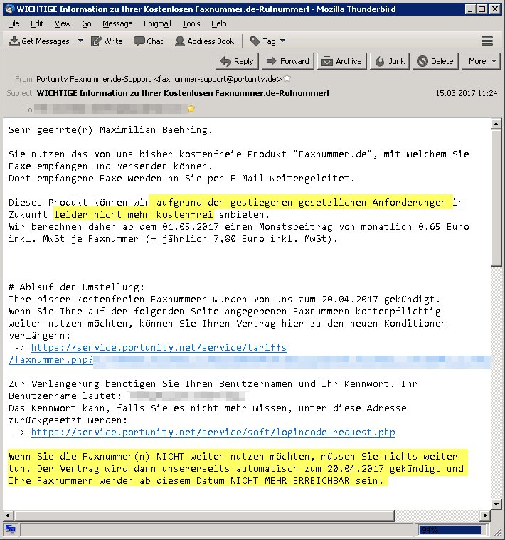 16.03.2017 02:30 Wenigsens verlagen Sie nicht daß man vone ienmsodnerkündigunsgrehct gebraucht macht, am besten mit dem Formerfodernis des Einschriebebreifes. ??? Forwarded Message ??? Sehr geehrte® Maximilian Baehring, Sie nutzen das von uns bisher kostenfreie Produkt ?Faxnummer.de?, mit welchem Sie Faxe empfangen und versenden können. Dieses Produkt können wir aufgrund der gestiegenen gesetzlichen Anforderungen in Zukunft leider nicht mehr kostenfrei anbieten. Wir berechnen daher ab dem 01.05.2017 einen Monatsbeitrag von monatlich 0,65 Euro inkl. MwSt je Faxnummer (= jährlich 7,80 Euro inkl. MwSt). # Ablauf der Umstellung: Zur Verlängerung benötigen Sie Ihren Benutzernamen und Ihr Kennwort. Ihr Benutzername lautet: Das Kennwort kann, falls Sie es nicht mehr wissen, unter diese Adresse zurückgesetzt werden: -> https://service.portunity.net/service/soft/logincode-request.php Wenn Sie die Faxnummer(n) NICHT weiter nutzen möchten, müssen Sie nichts weiter tun. Der Vertrag wird dann unsererseits automatisch zum 20.04.2017 gekündigt und Ihre Faxnummern werden ab diesem Datum NICHT MEHR ERREICHBAR sein! # Rufnummern-Mitnahme: Sie können Ihre Faxnummer/n vor dem Kündigungsdatum zu einem anderen Anbieter portieren. # Fragen und Support: Falls Sie Fragen zur Umstellung auf das kostenpflichtige Angebot haben, steht Ihnen unser Support-Team gerne zur Verfügung: Viele Fragen werden bereits durch unsere FAQ beantwortet: Sollte Ihre Frage darin nicht beantwortet werden, können Sie einfach auf diese E-Mail antworten. Mit freundlichen Grüßen Portunity GmbH http://www.portunity.de Telefon: +49 (0)202 - 69555 - 610 USt-Identnummer DE206277867 [0] "201703160230-158474848518-0.jpg" |