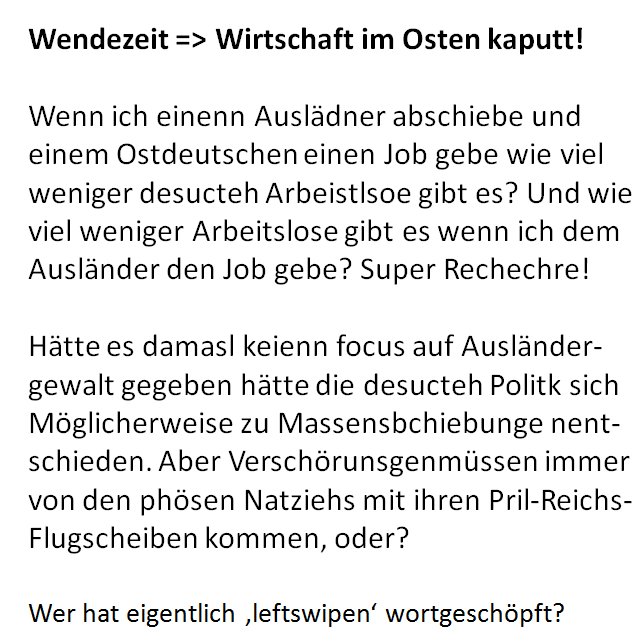 16.03.2017 06:53 http://www.tvinfo.de/fernsehprogramm/416709253-die-neuen-nazis Wenn ich einenn Auslädner abschiebe und einem Ostdeutschen einen Job gebe wie vielweniger desucteh Arbeistlsoe gibt es? Und wie viel weniger Arbeitslose gibt es wenn ich dem Ausländer den Job gebe? [0] "201703160653-158481981393-0.jpg" [1] "201703160653-158481981393-1.jpg" [2] "201703160653-158481981393-2.jpg" [3] "201703160653-158481981393-3.jpg" [4] "201703160653-158481981393-4.jpg" |