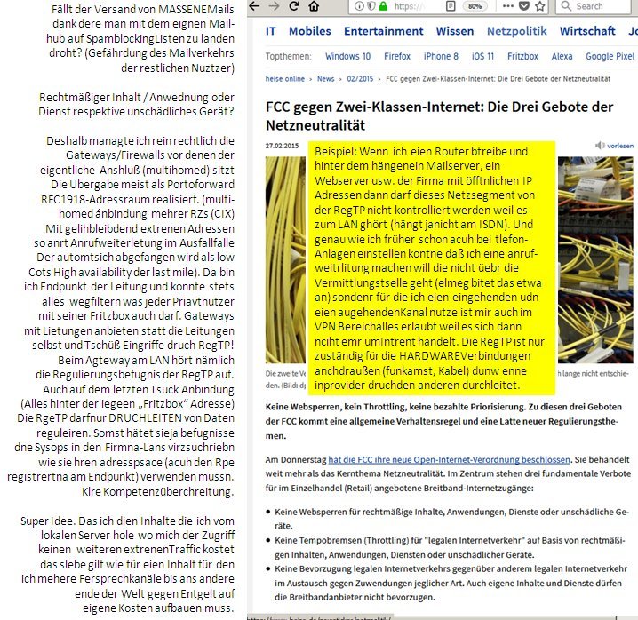 Beim Agteway am LAN hört nämlich die Regulierungsbefugnis der RegTP auf.Auch auf dem letzten Tsück Anbindung(Alles hinter der iegeen ?Fritzbox? Adresse)Die RgeTP darfnur DRUCHLEITEN von Datenreguleiren. Somst hätet sieja befugnisse dne Sysops in den Firmna-Lans virzsuchriebn wie sie hren adresspsace (acuh den Rpe registrertna am Endpunkt) verwenden müssn.Klre Kompetenzüberchreitung.Super Idee. Das ich dien Inhalte die ich vom