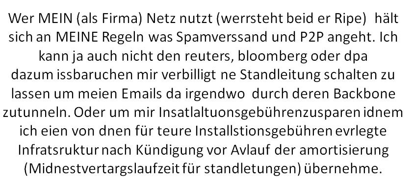 Wer MEIN (als Firma) Netz nutzt (werrsteht beid er Ripe)  hält sich an MEINE Regeln was Spamverssand und P2P angeht. Ich kann ja auch nicht den reuters, bloomberg oder dpadazum issbaruchen mir verbilligt ne Standleitung schalten zu lassen um meien Emails da irgendwo  durch deren Backbone zutunneln. Oder um mir Insatlaltuonsgebührenzusparen idnem ich eien von dnen für teure Installstionsgebühren evrlegte Infratsruktur nach Kündigung vor Avlauf der amortisierung (Midnestvertargslaufzeit für standletungen) übernehme.