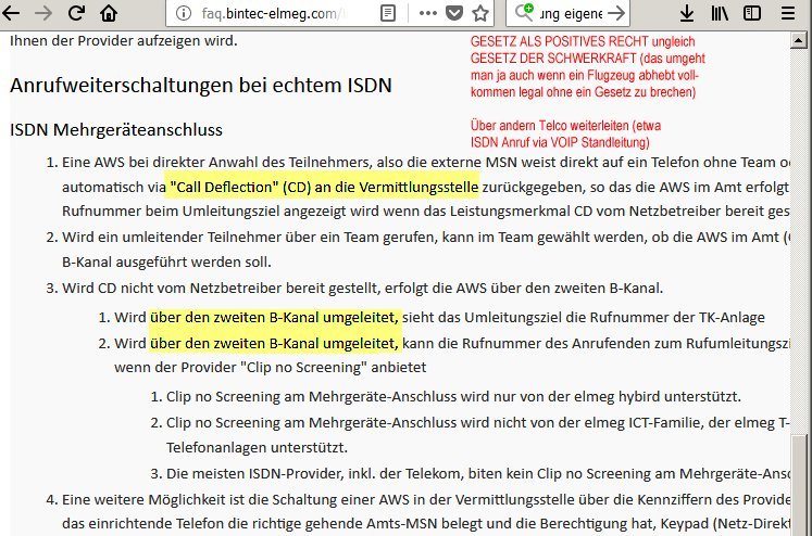Beispiel: Wenn  ich eien Router btreibe und hinter dem hängenein Mailserver, ein Webserver usw. der Firma mit öfftnlichen IP Adressen dann darf dieses Netzsegment von der RegTP nicht kontrolliert werden weil es zum LAN ghört (hängt janicht am ISDN). Und genau wie ich früher schon acuh bei tlefon-Anlagen einstellen kontne daß ich eine anruf-weitrlitung machen will die nicht üebr die Vermittlungstselle geht (elmeg bitet das etwa an http://faq.bintec-elmeg.com/index.php/Anrufweiterschaltung_/_Rufumleitung_%E2%80%93_Allgemeine_Hinweise_zu_IP-_und_ISDN-Anschl%C3%BCssen) sondenr für die ich eien eingehenden udn eien augehendenKanal nutze ist mir auch im VPN Bereichalles erlaubt weil es sich dann nciht emr umIntrent handelt. Die RegTP ist nur zuständig für die HARDWAREVerbindungen anchdraußen (funkamst, Kabel) dunw enne inprovider druchden anderen durchleitet.