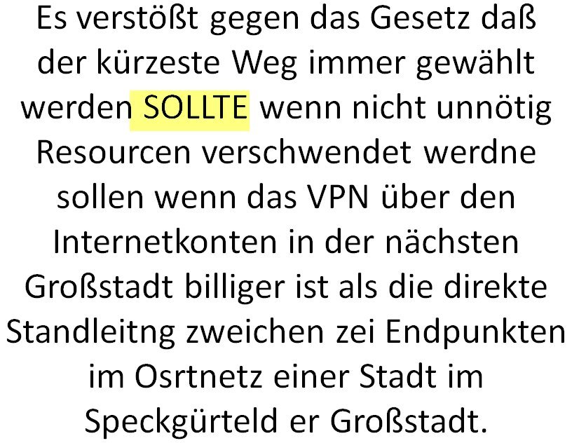 Es verstößt gegen das Gesetz daß der kürzeste Weg immer gewählt werden SOLLTE wenn nicht unnötig Resourcen verschwendet werdne sollen wenn das VPN über den Internetkonten in der nächsten Großstadt billiger ist als die direkte Standleitng zweichen zei Endpunkten im Osrtnetz einer Stadt im Speckgürteld er Großstadt.