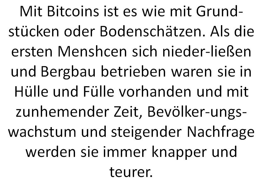 http://www.spiegel.de/wirtschaft/unternehmen/bitcoin-was-der-hype-ueber-den-finanzkapitalismus-verraet-kolumne-a-1183412.html Mit Bitcoins ist es wie mit Grund-stücken oder Bodenschätzen. Als die ersten Menshcen sich nieder-ließen und Bergbau betrieben waren sie in Hülle und Fülle vorhanden und mit zunhemender Zeit, Bevölker-ungs-wachstum und steigender Nachfrage werden sie immer knapper und teurer.