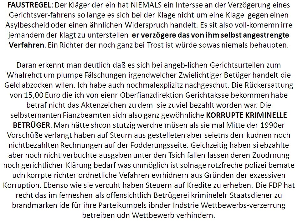 Daran erkennt man deutlich daß es sich bei angeb-lichen Gerichtsurteilen zum Whalrehct um plumpe Fälschungen irgendwelcher Zwielichtiger Betüger handelt die Geld abzocken wllen. Ich habe auch nochmalexplizitz nachgeschut. Die Rückersattung von 15,00 Euro die ich von eienr Oberfianzdirektion Gerichtaksse bekommen habe betraf nicht das Aktenzeichen zu dem  sie zuviel bezahlt worden war. Die selbsternanten Fianzbeamten sidn also ganz gewöhnliche KORRUPTE KRIMINELLE BETRÜGER. Man hätte shcon stutzig werdne müsen als sie mal Mitte der 1990er Vorschüße verlangt haben auf Steurn aus gestelleten aber seietns derr kudnen noch nichtbezahlten Rechnungen auf der Fodderungsseite. Geichzeitig haben si ebzahlte aber noch nicht verbuchte ausgaben unter den Tsich fallen lassen deren Zuodrnung noch gerichtlicher Klärung bedarf was unmöglich ist solnage rotzfreche polizei bemate udn korrpte richter ordnetliche Vefahren evrhidnern aus Gründen der exzessiven Korruption. Ebenso wie sie vercuht haben Steuern auf Kredite zu erheben. Die FDP hat recht das im ferneshen als offensichtlich Betrügerei kriminelelr Staatsdiener zu brandmarken ide für ihre Parteikumpels ibnder Indstrie Wettbewerbs-verzerrung betreiben udn Wettbewerb verhindern.